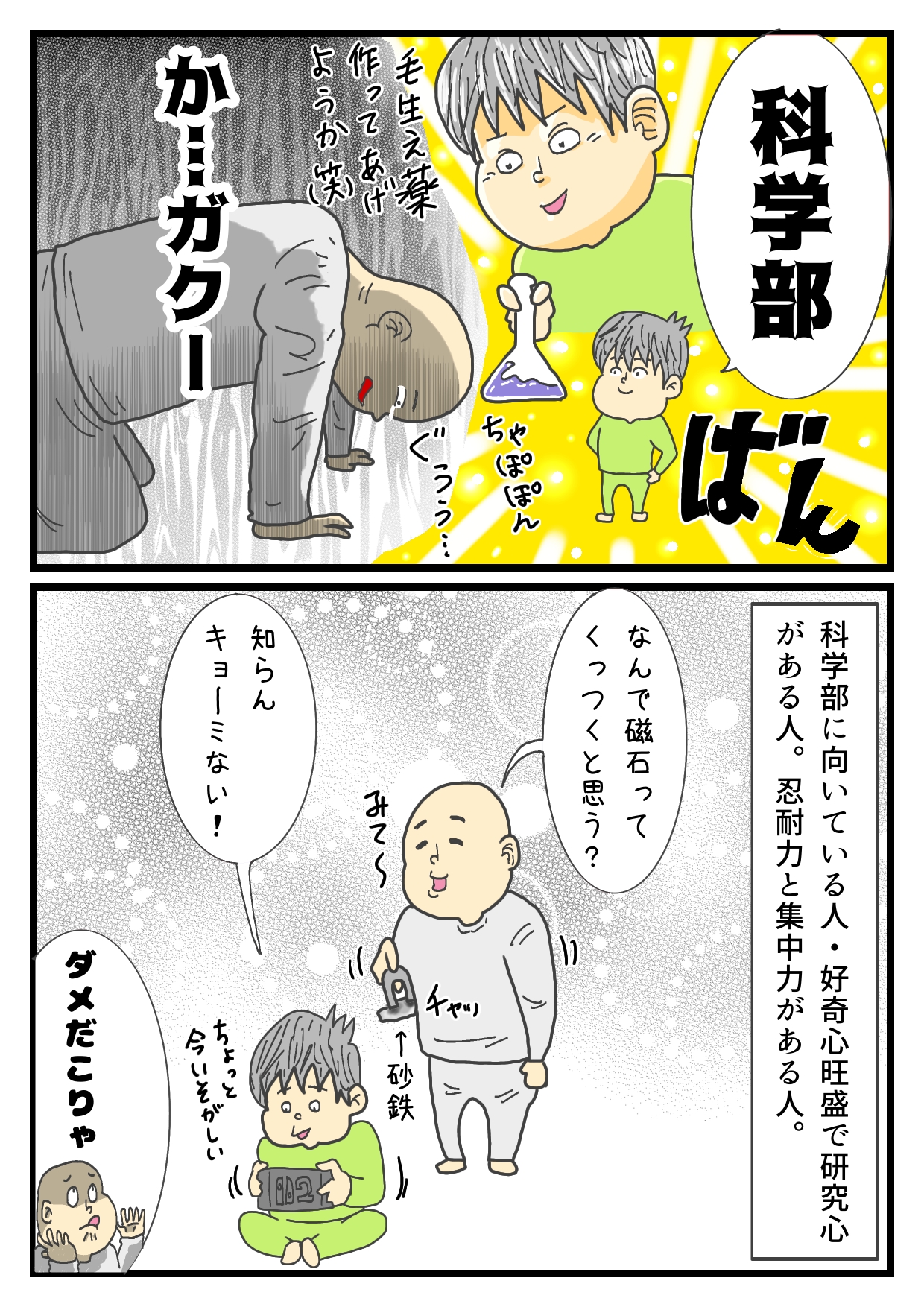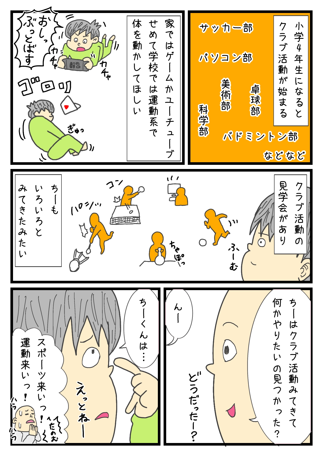 親のこころとはウラハラに体を動かすことをかたくなに拒む息子。土手でやるキャッチボールやサッカーは好きなんだけど、所属して何かやることにすごく否定的。空手をすすめて体験会でやめる。バスケットボール体験をしてみたら開始30分でやめる。現在は親友とキックボクシングを月1回やっているけど、熱くはないんだよなぁ…。学校で友達と一緒に運動系であつい男になって欲しいな(*’ω’*)