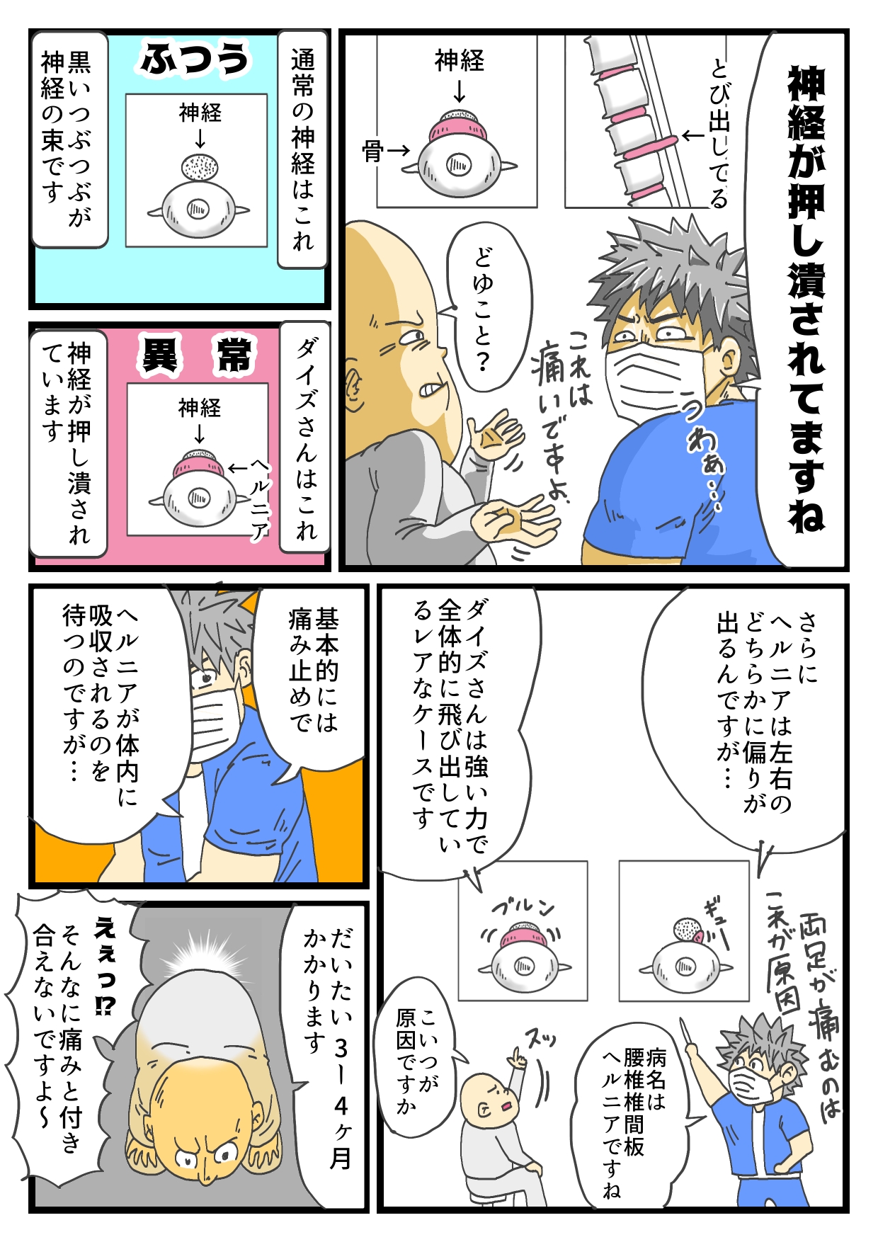 「もしかしたらヘルニアかも、狭窄症かも、坐骨神経痛かも、かもかもかも」と医師の言葉